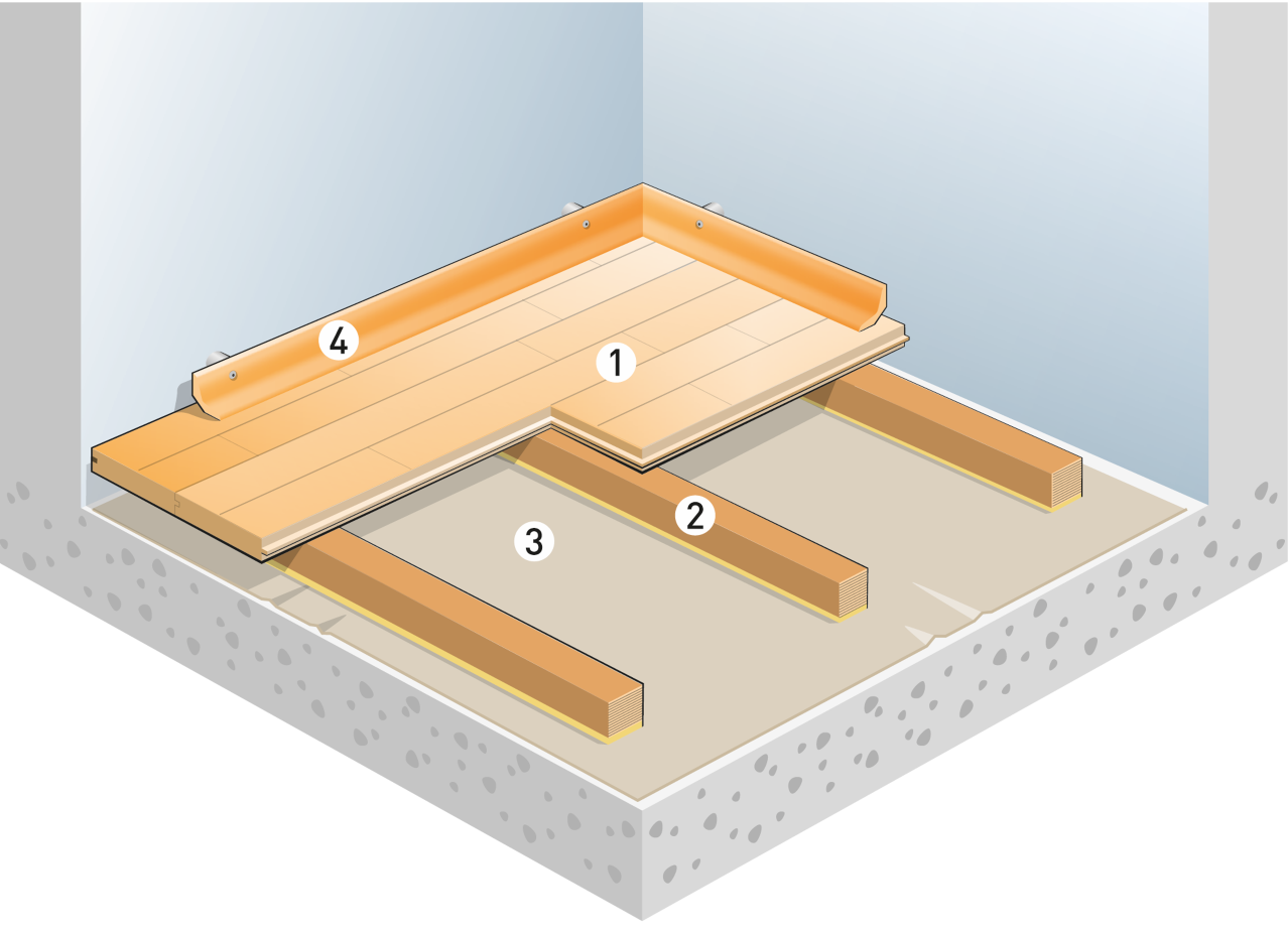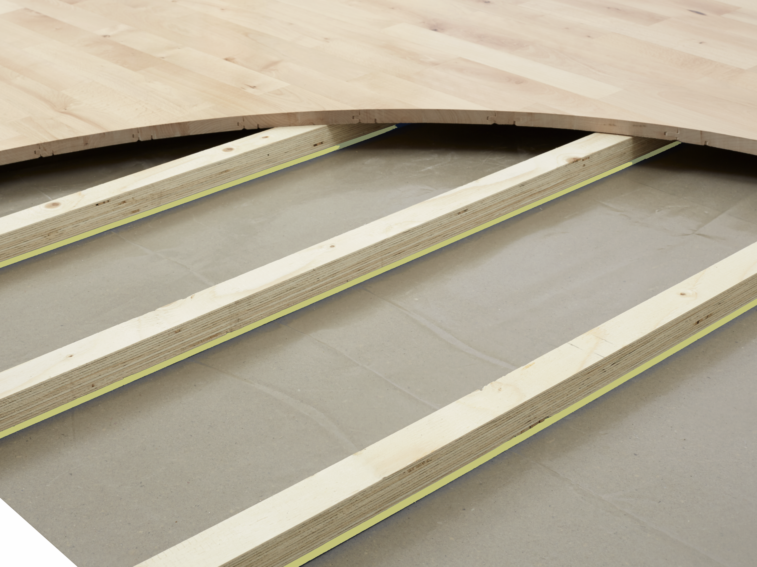 De 22 mm massiva trägolvsbrädorna fästs på ett fjädrande undergolvssystem som består av enskiktade konstruerade reglar monterade på ett kontinuerligt lager av stötdämpande skum.