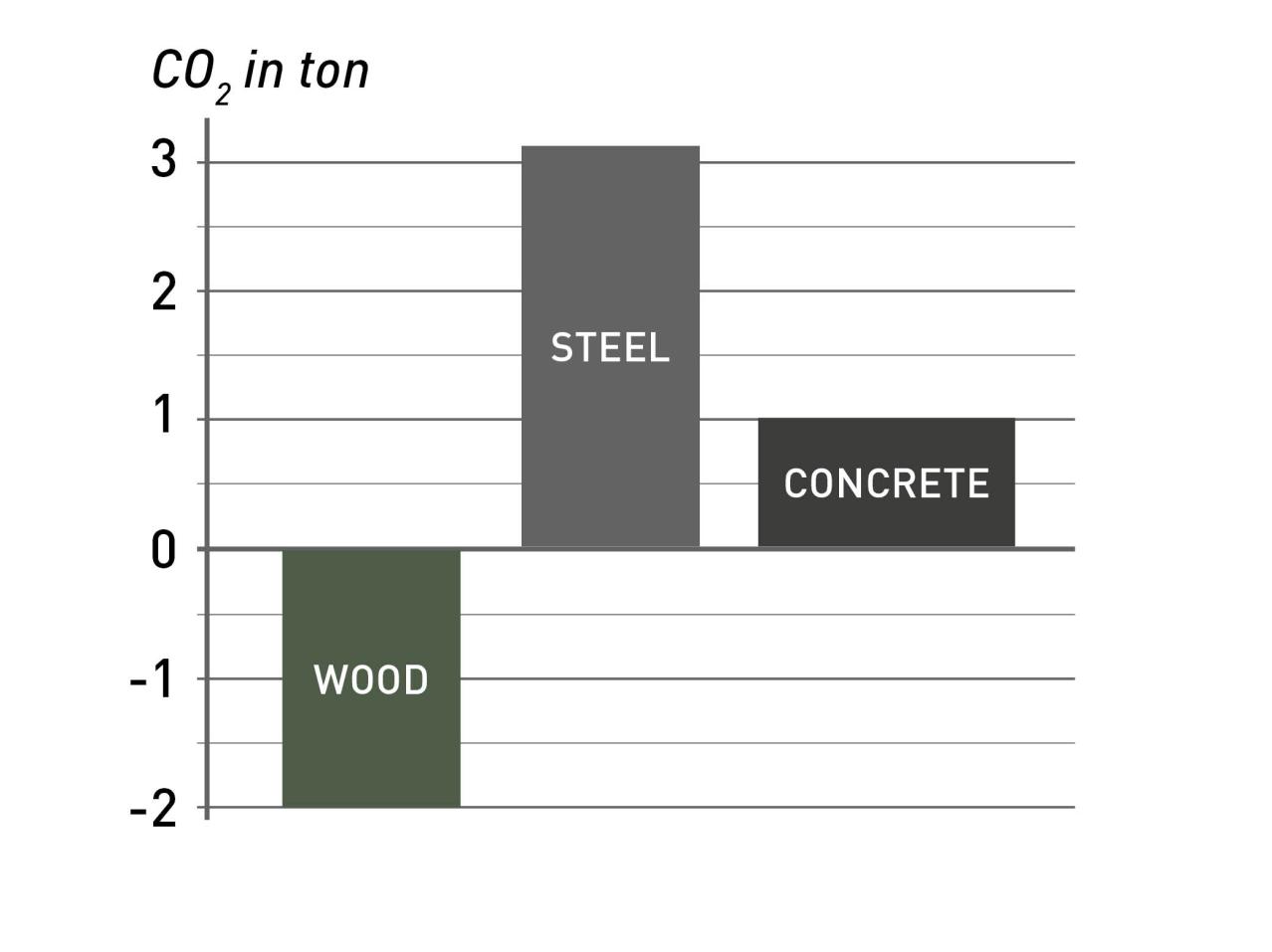 Cement och stål släpper ut en stor mängd koldioxid under tillverkningen. Men växande träd binder koldioxid istället för att släppa ut det. Detta diagram visar tydligt varför trä är så bra som byggmaterial jämfört med andra byggmaterial.