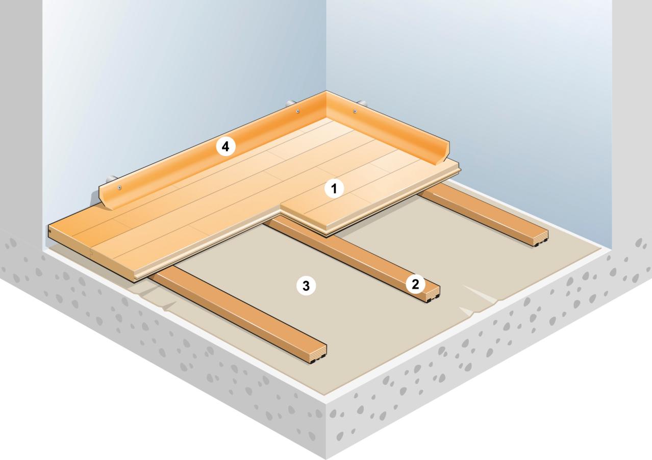 Systemet består av Junckers massiva parkettbrädor med en tjocklek på 22 mm, som sätts fast i en laminerad barrträregel. De fanerade reglarna är försedda med specialutvecklade gummilister, som är monterade på undersidan av regeln med en inbyggd deformationsbegränsare. Detta garanterar, att regelsysteme levererar optimal stötdämpning och bollstuds på ett likartat sätt över hela golvytan.